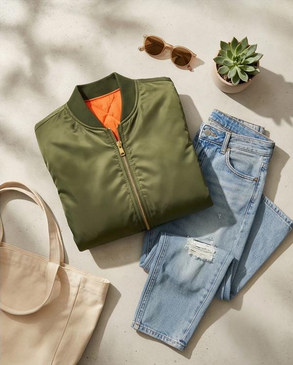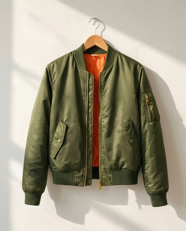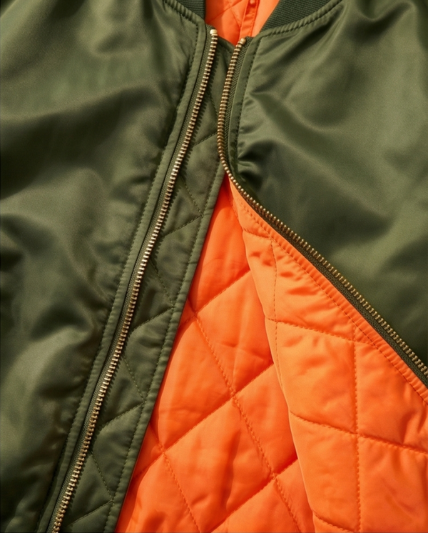 Step into confidence with a bold, modern look. This bomber jacket features a sleek silhouette with a statement interior contrast that adds an unexpected edge.