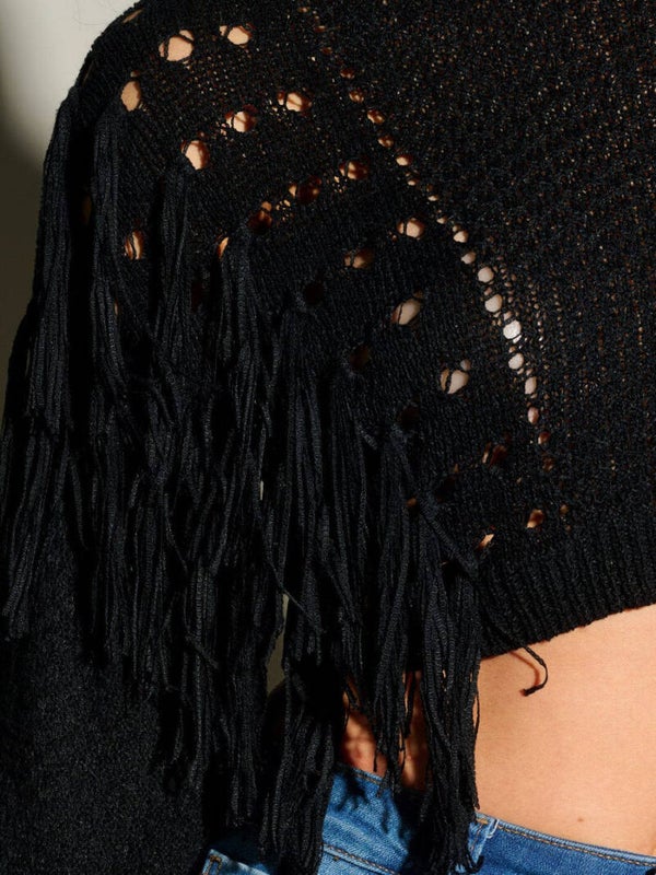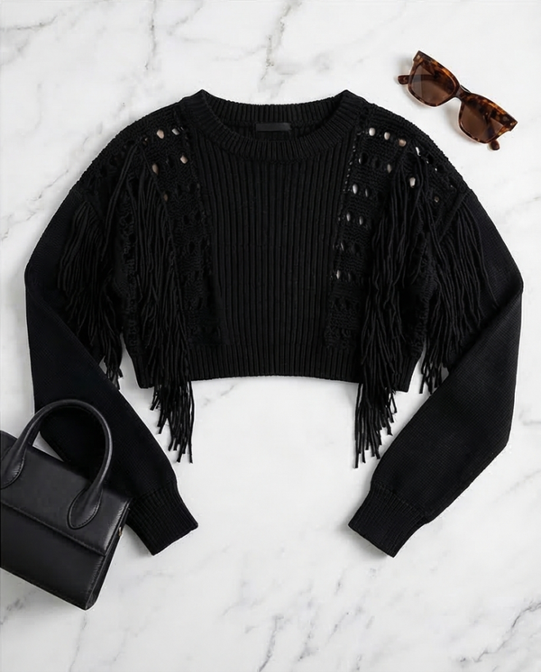 Midnight Fringe Crop Knit Sweater β Bold & Chic