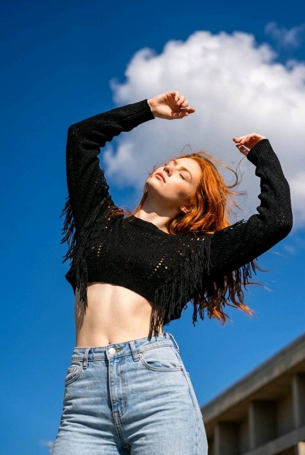 Designed for the bold and confident woman, this piece features a unique open-knit design with eye-catching fringe details that add movement and edge to your look. The cropped fit highlights your silhouette while keeping your outfit stylish and modern.