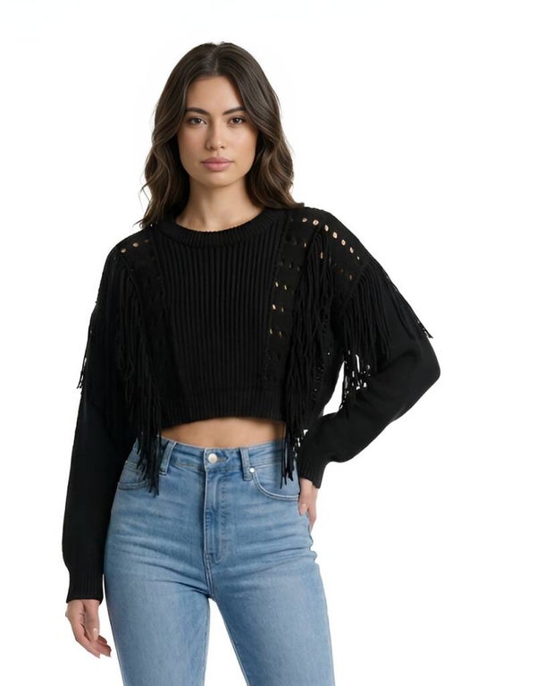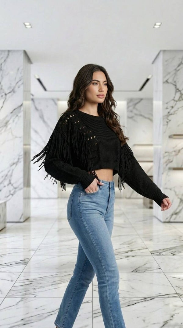 Turn heads effortlessly with our Midnight Fringe Crop Knit Sweater.
