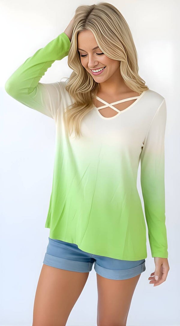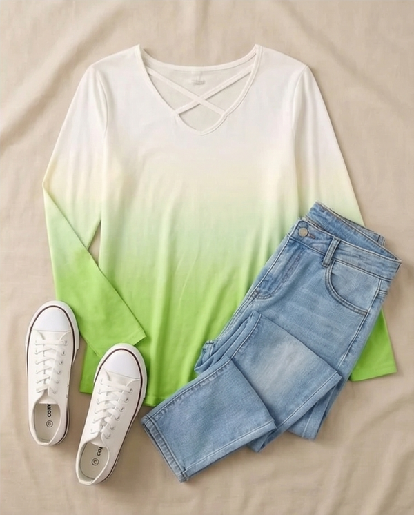 Featuring a soft white-to-green gradient and a flattering criss-cross neckline, this top adds a modern and feminine touch to your everyday wardrobe. Lightweight and breathable, it’s perfect for casual days, running errands, or relaxed outings while still looking put together.