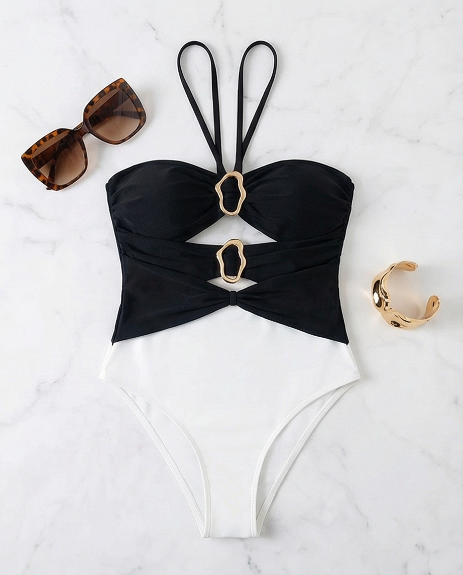 The Mabelinda Luxe Riviera One-Piece is designed to turn heads. Featuring a sculpting fit, elegant cut-out details, and gold hardware accents, this swimsuit gives you that high-end, resort-ready look instantly.
