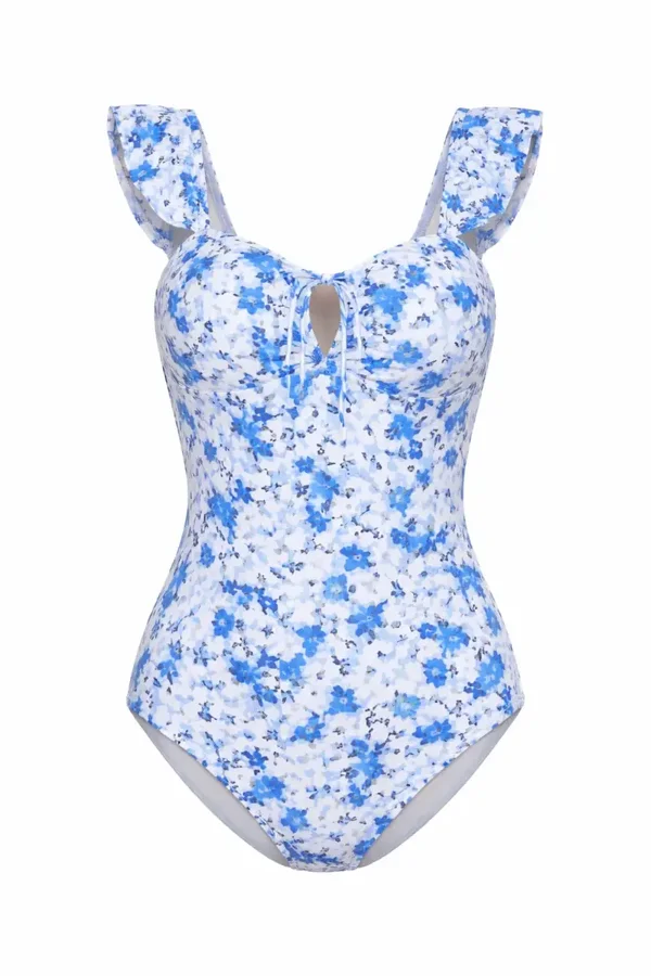 The Mabelinda Blue Bloom One-Piece brings a romantic touch to your swimwear collection. Designed with delicate floral prints, ruffle straps, and a flattering silhouette, this piece gives you that effortless beach glow.