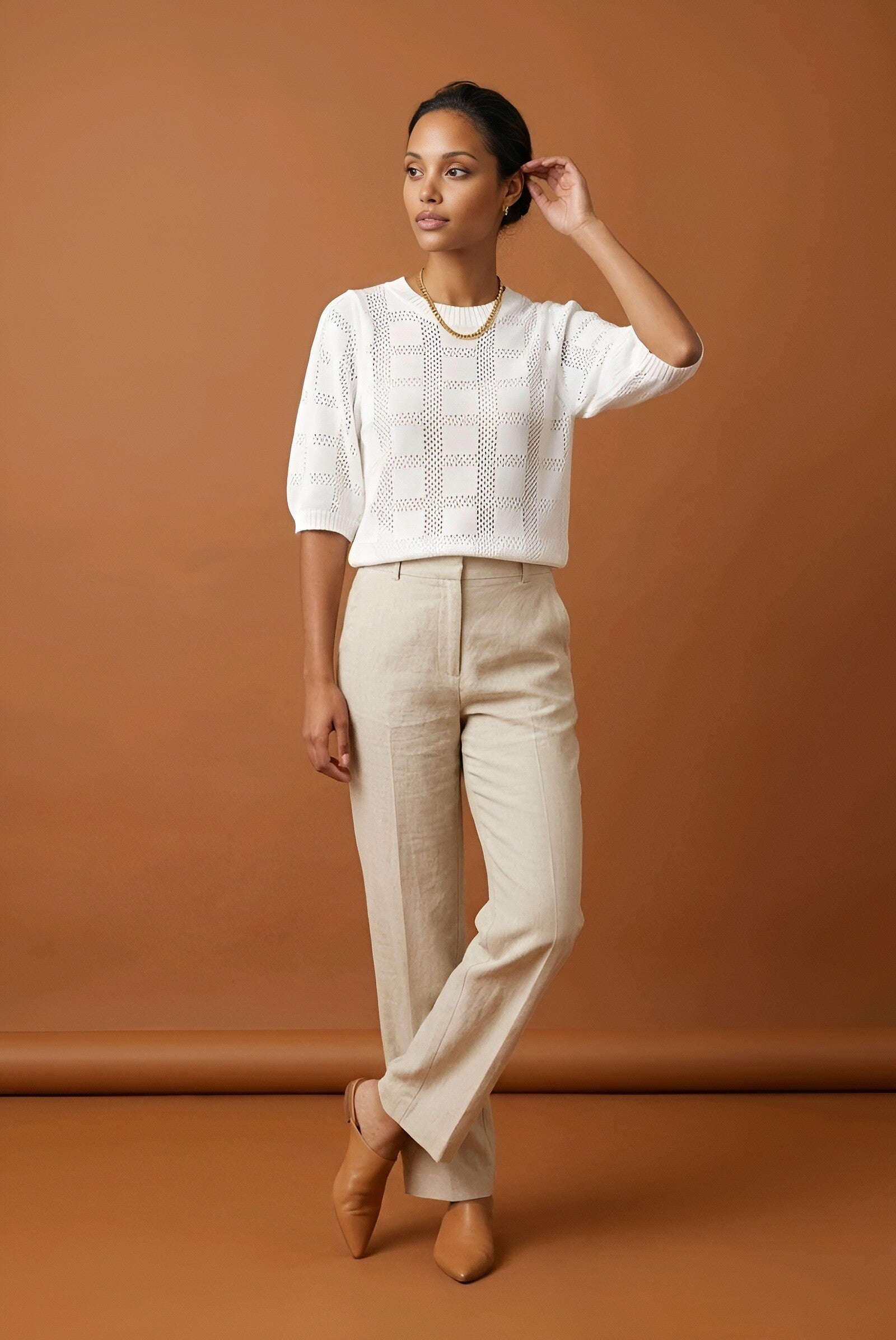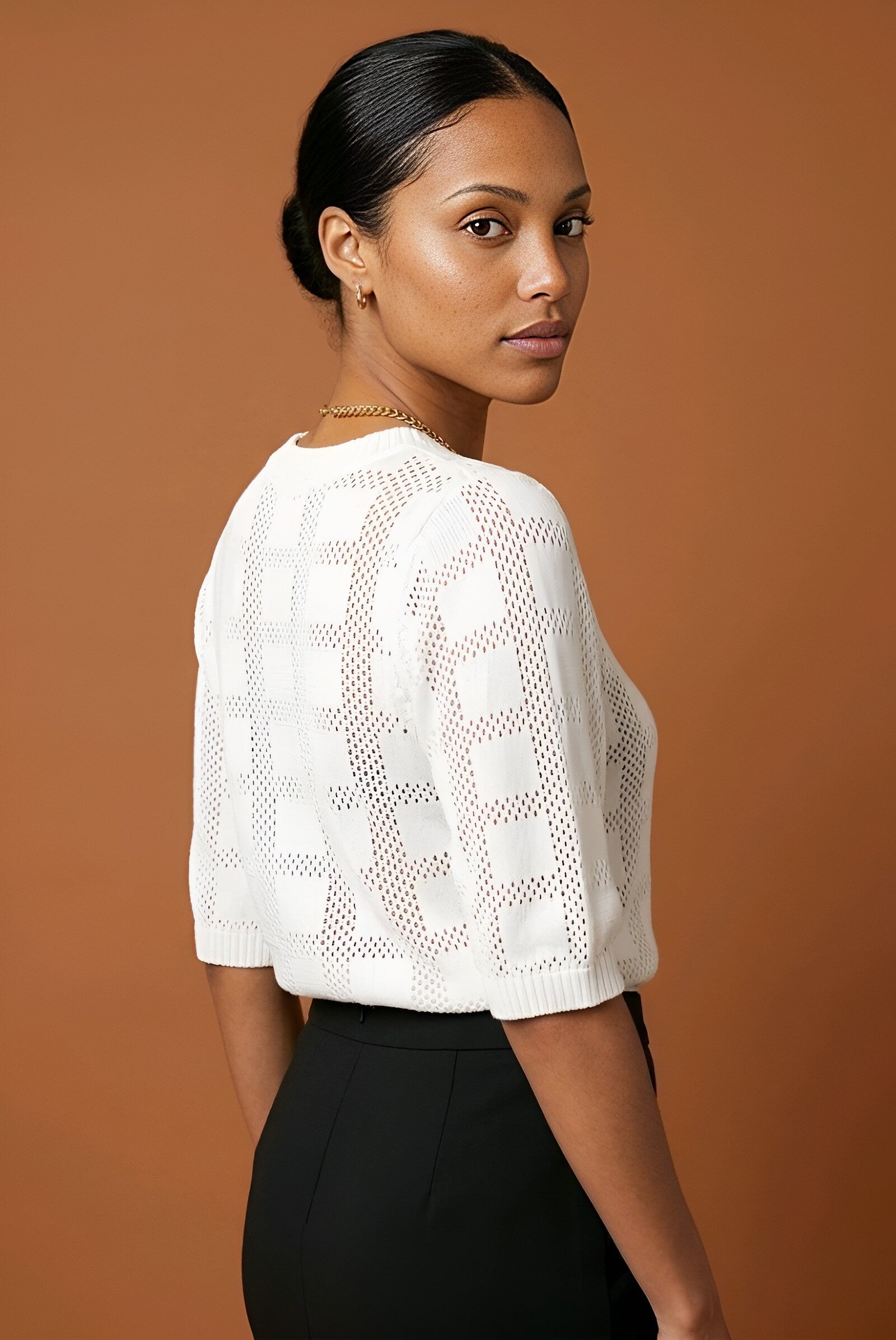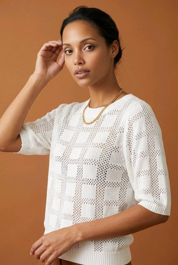 This lightweight knit top features a subtle textured pattern and a relaxed silhouette that blends comfort with sophistication.