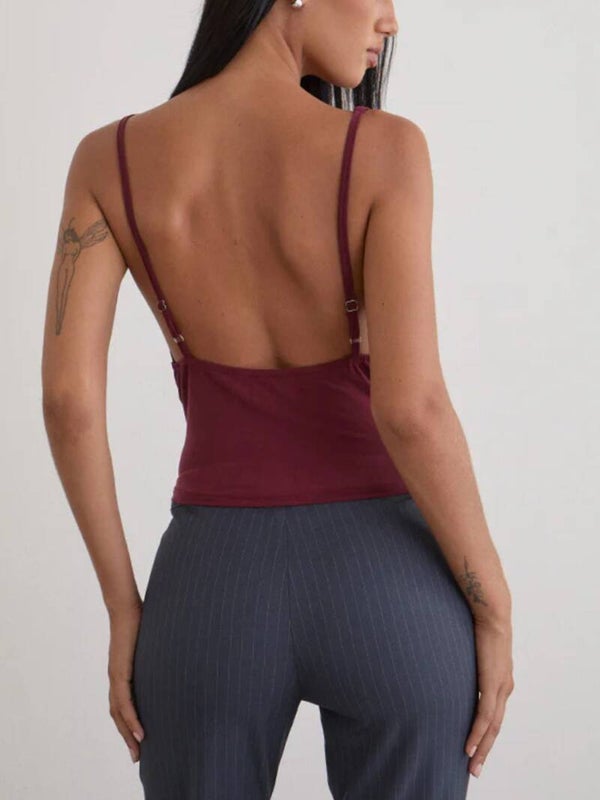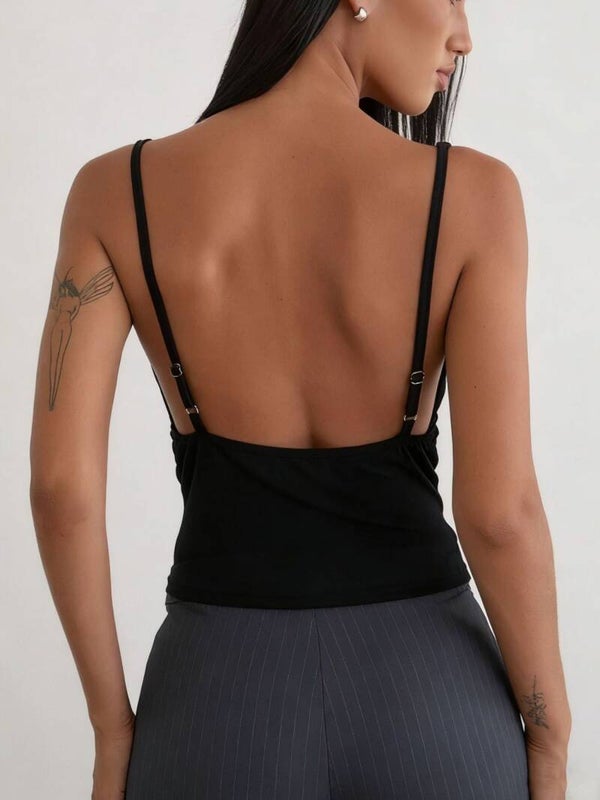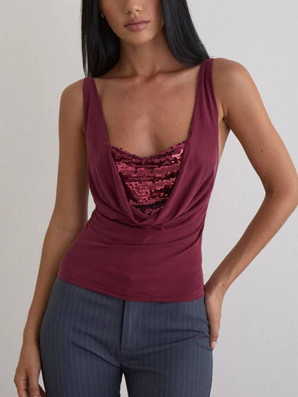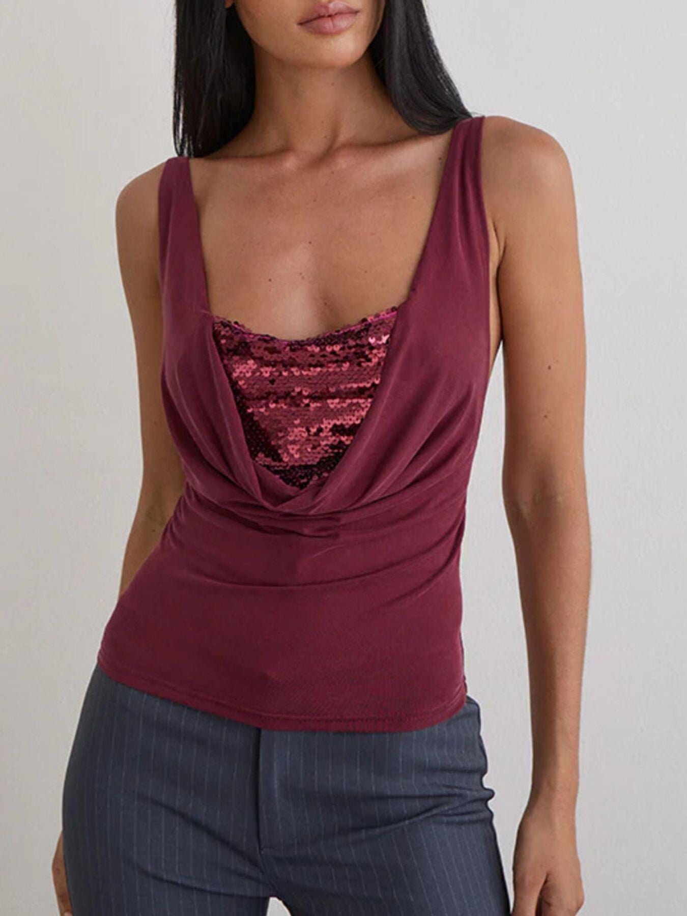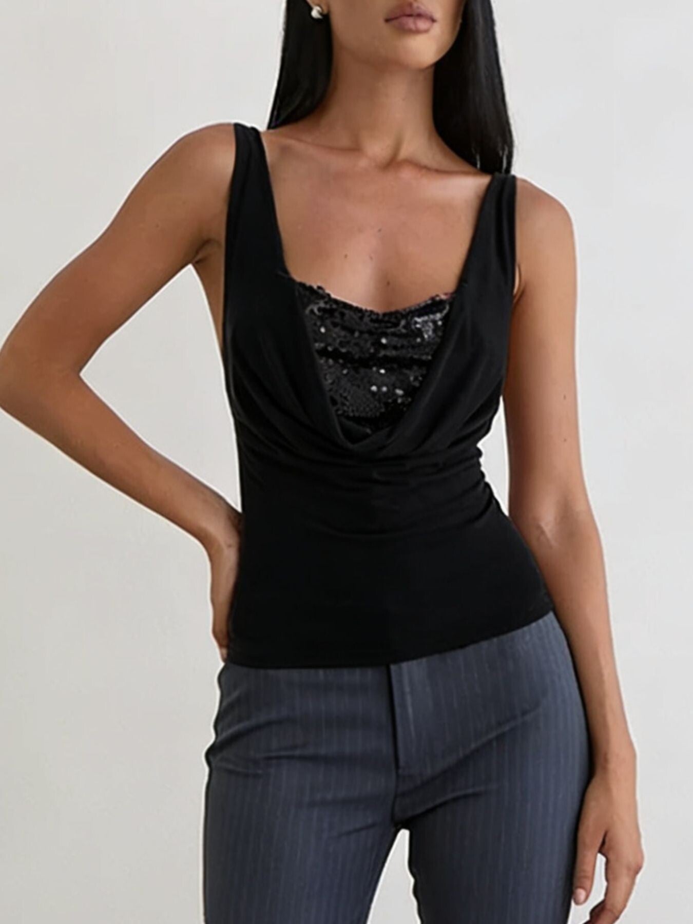 This ruched tank features a soft draped neckline with a subtle sequin detail that adds just the right amount of glow. Designed to hug your shape and elevate your look, it’s the perfect piece for nights when you want to stand out effortlessly.