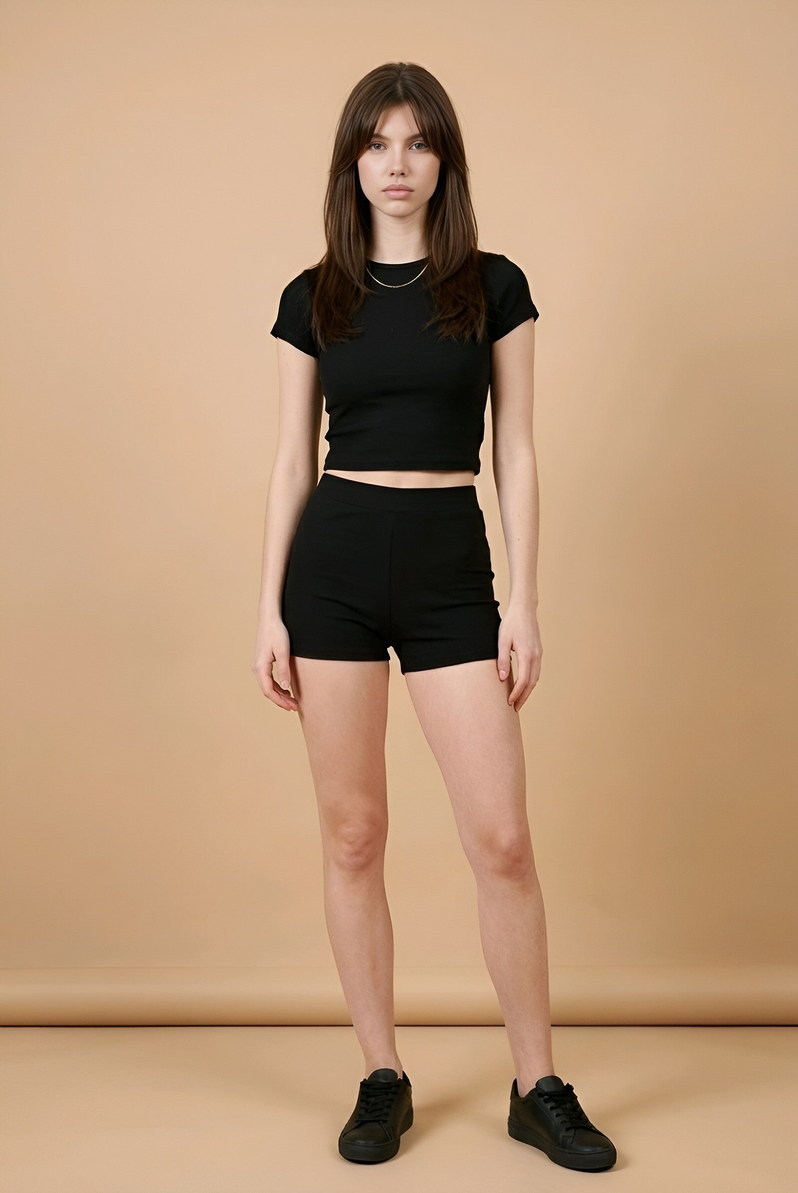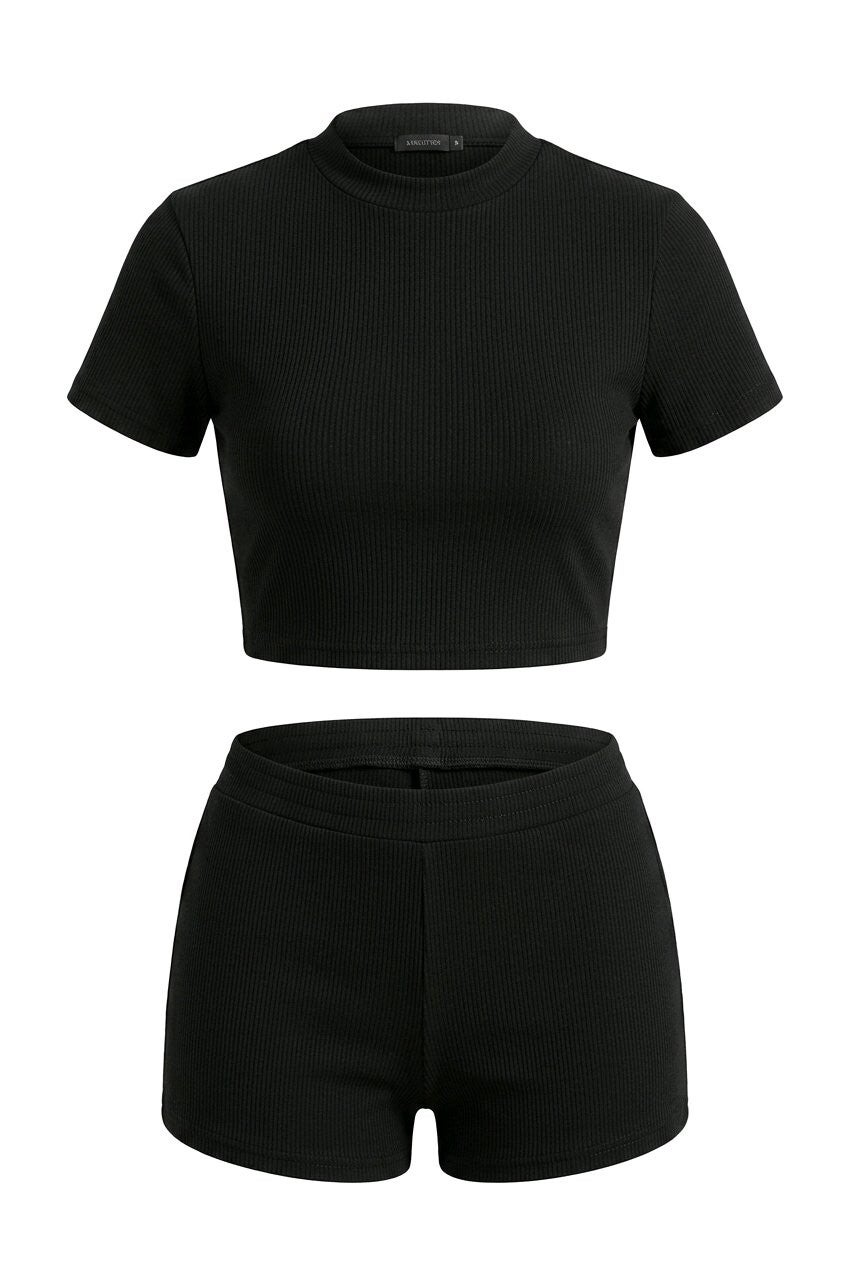 The fitted crop tee paired with high-waisted shorts creates a sleek, sculpted look while keeping you comfortable all day.