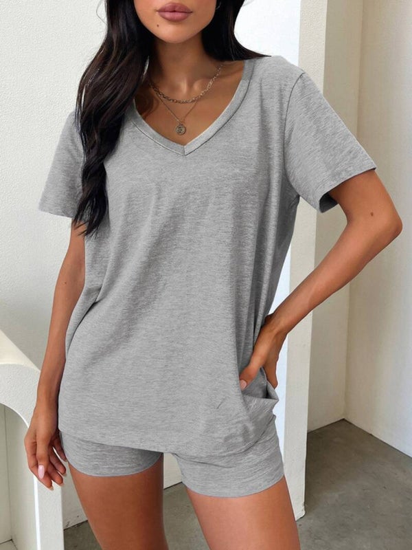 This matching set is the definition of comfort + style. Featuring a relaxed V-neck tee and high-waisted fitted shorts, it’s perfect for everyday wear while still keeping you looking put together.