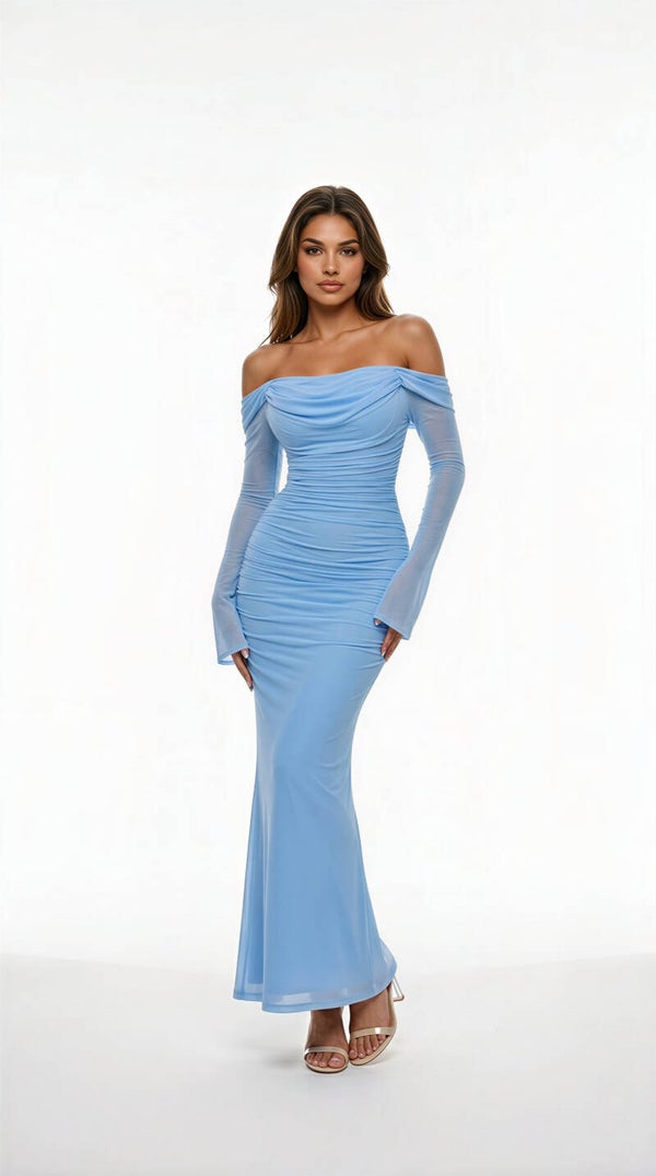 This off-shoulder ruched gown was made for your biggest moment. Designed to sculpt your figure and highlight your curves, it gives you that confident, elegant ‘all eyes on me’ energy the second you walk in.