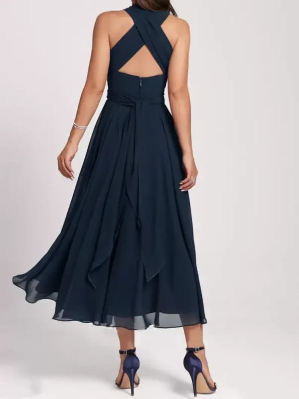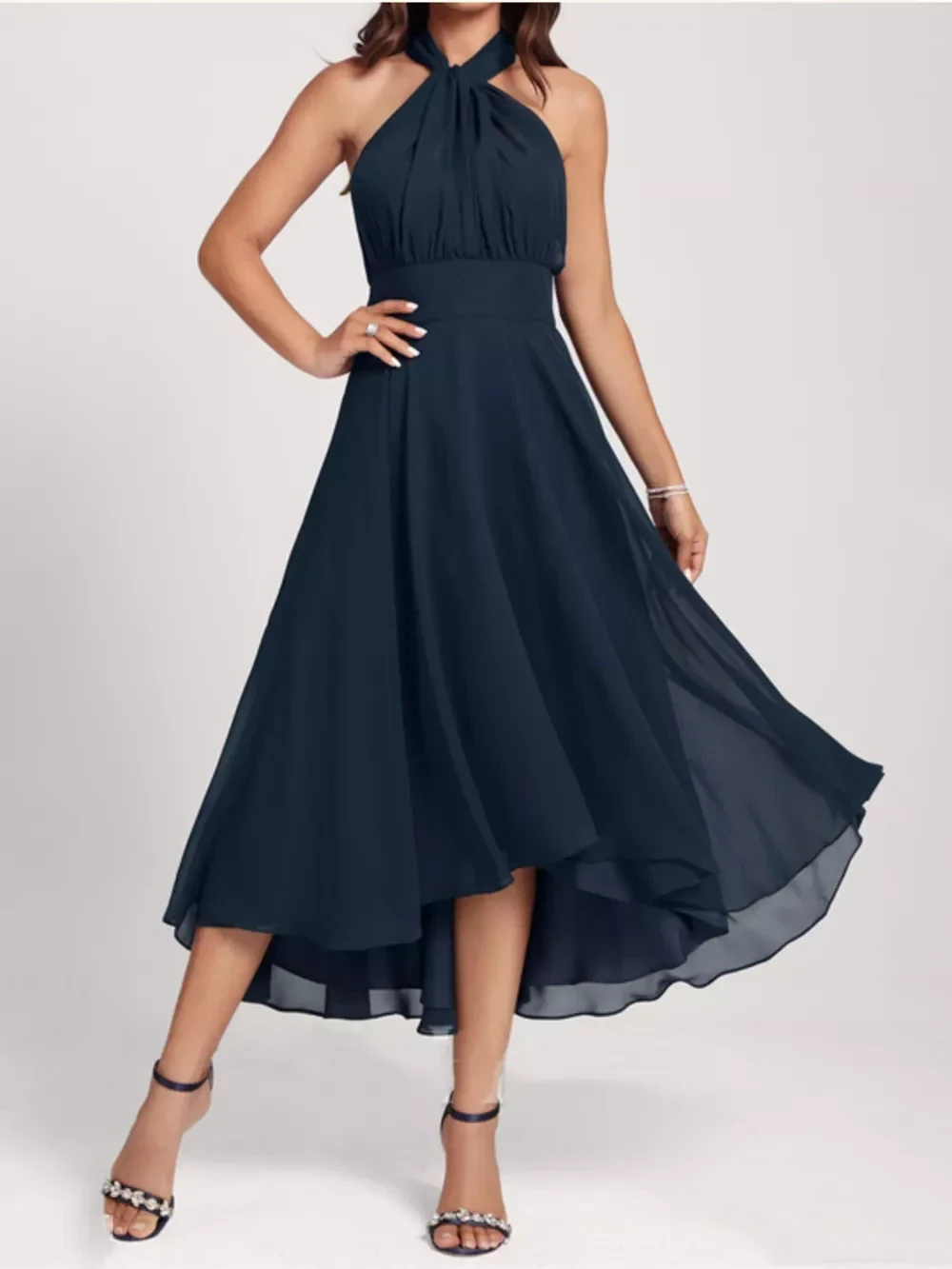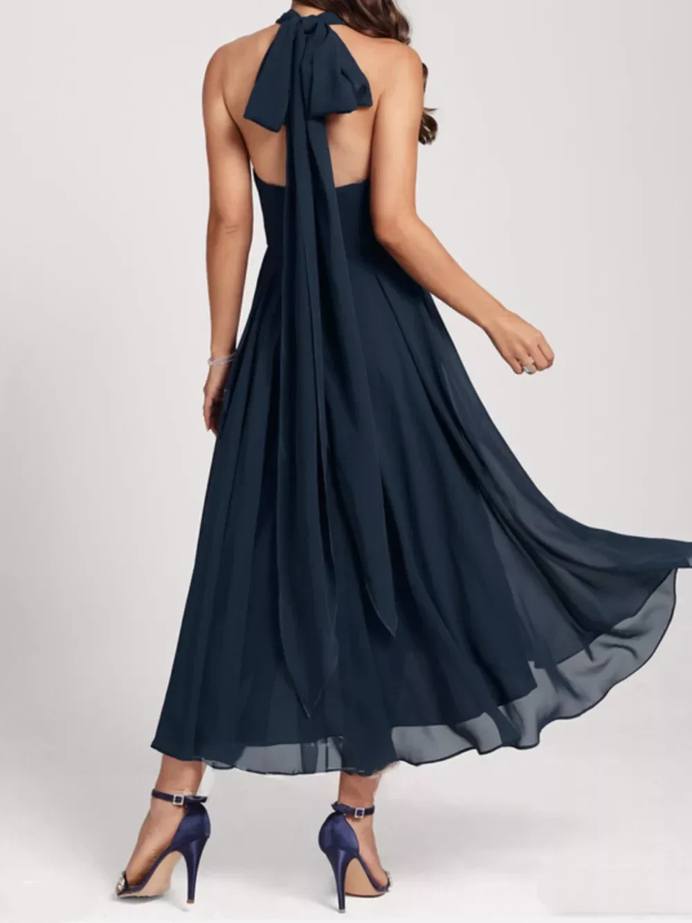 The Mabelinda Midnight Grace Ruched A-Line Midi Dress brings timeless elegance with a modern, feminine touch. The halter neckline frames your shoulders beautifully, while the ruched bodice adds soft detail that enhances your natural shape.
